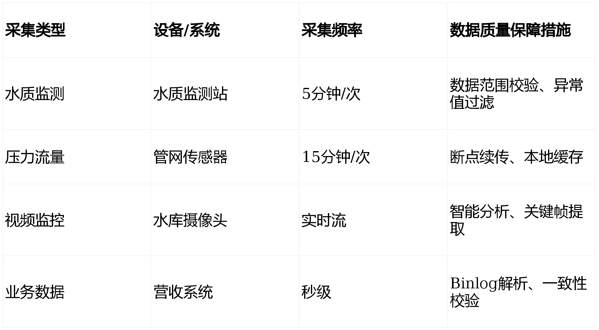 :建设全域覆盖的水务大数据中心,实现源头水、供排水、节水及水权等全生命周期数据的全量采集与治理,消除信息孤岛,形成统一的数据底座。